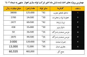 قراداد تامین 125 هزار متر لوله 42 اینچی به ارزش 3.8 همت با شرکت ملی مناطق نفتخیر جنوب و قرارداد تامین 72 هزار متر لوله 30 اینچی با شرکت حفاری شمال به ارزش 1.3 همت از جمله مهترین پروژههای لولهسازی اهواز است.