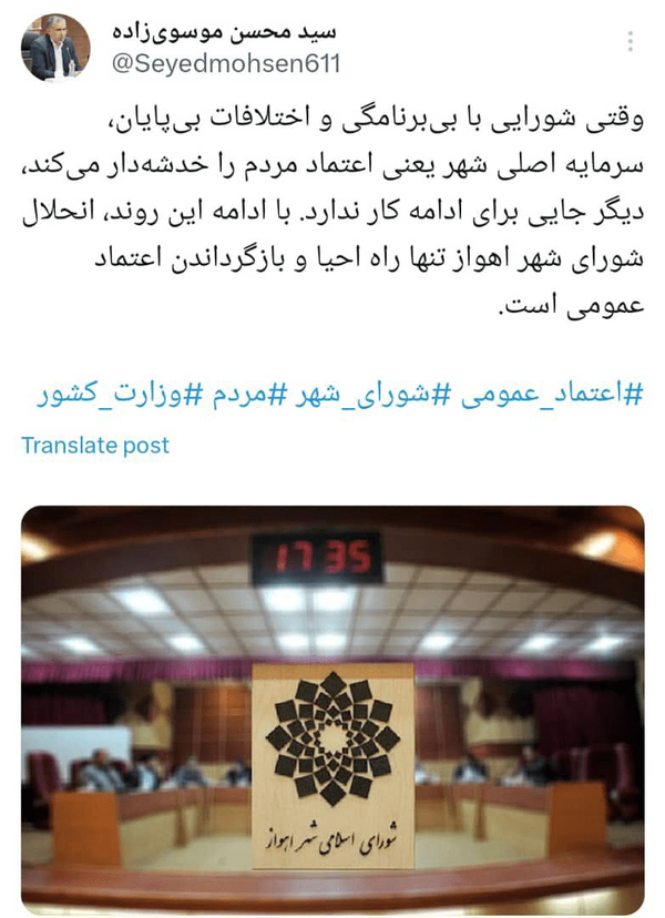 به گزارش عصر اتحاد سید محسن موسوی‌زاده نماینده مردم اهواز در مجلس شورای اسلامی، در توییتی به عملکرد شورای شهر اهواز واکنش نشان داد و نوشت:«وقتی شورایی با بی‌برنامگی و اختلافات بی‌پایان، سرمایه اصلی شهر یعنی اعتماد مردم را خدشه‌دار می‌کند، دیگر جایی برای ادامه کار ندارد. با ادامه این روند، انحلال شورای شهر اهواز تنها راه احیا و بازگرداندن اعتماد عمومی است.»