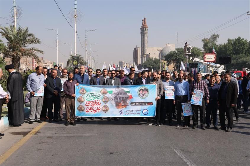 به گزارش عصر اتحاد به نقل از روابط عمومی شرکت آب و فاضلاب استان خوزستان، همزمان با راهپیمایی پر شور مردم ولایتمدار و دانش آموزان استان خوزستان به مناسبت سیزدهم آبان ماه، روز مبارزه با استکبار و گرامیداشت روز دانش آموز، مدیر عامل، معاونین ، مدیران و جمعی از کارکنان شرکت آبفا خوزستان در اهواز و سایر شهرهای استان در کنار دیگر اقشار مردم با حضور در این راهپیمایی عظیم، دیگر بار با آرمان های انقلاب و مقام معظم رهبری تجدید پیمان نمودند و روز مبارزه با استکبار را گرامی داشتند.