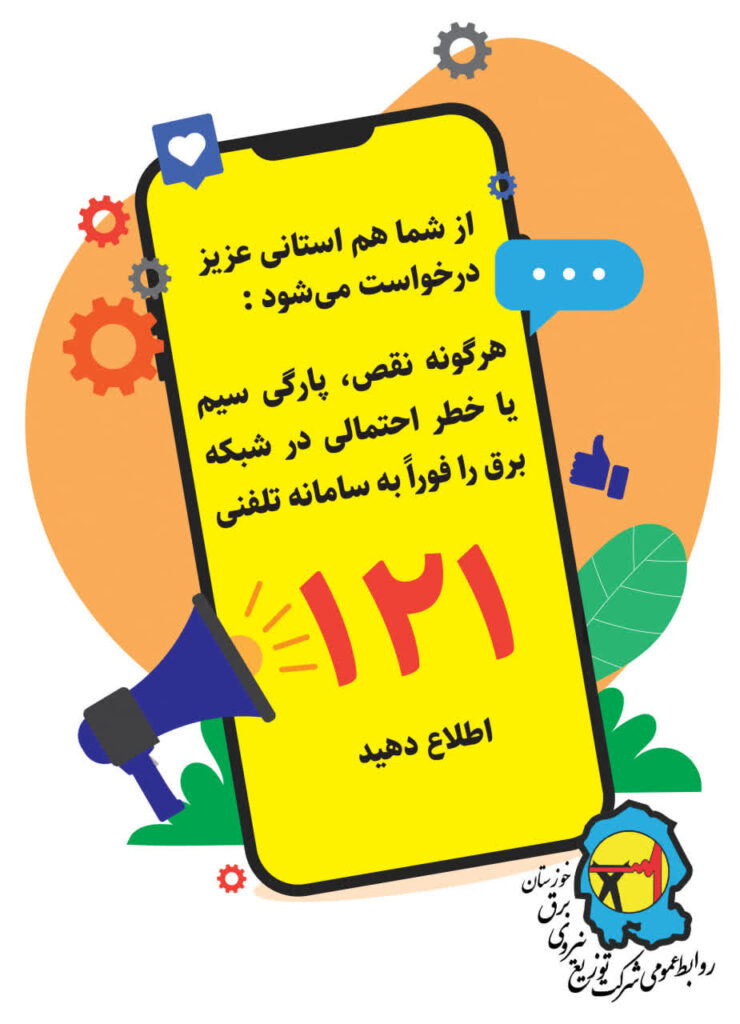 اهواز-عصر اتحاد: هرگونه نقص فنی،پارگی سیم یا خطر احتمالی در شبکه برق را فوری به سامانه ۱۲۱ اطلاع دهید. از شما هم استانی های عزیز درخواست می شود: هرگونه نقص فنی،پارگی سیم یا خطر احتمالی در شبکه برق را فوری به سامانه ۱۲۱ اطلاع دهید. روابط عمومی شرکت توزیع نیروی برق خوزستان